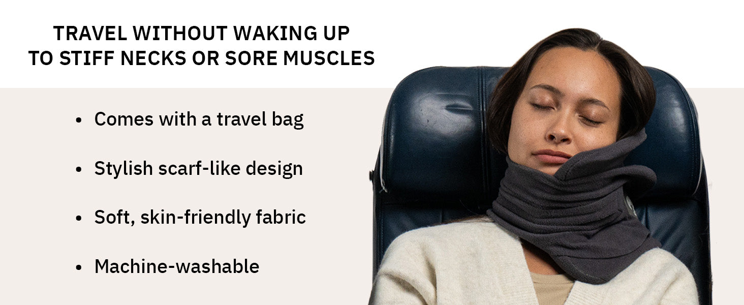 It’s incredibly easy to use: Undo the fastening, position the internal support comfortably against your neck, and wrap it like a scarf. For added versatility, you can also place it between your neck and seat for support while reading, watching movies, or relaxing during travel.